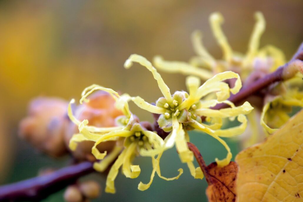 Once the witch hazel’s woody capsules have dried out, you should tie a large bow around the shrub. This is because the capsules can suddenly burst open with a pop, scattering their seeds for metres around – at speeds of over twelve metres per second.